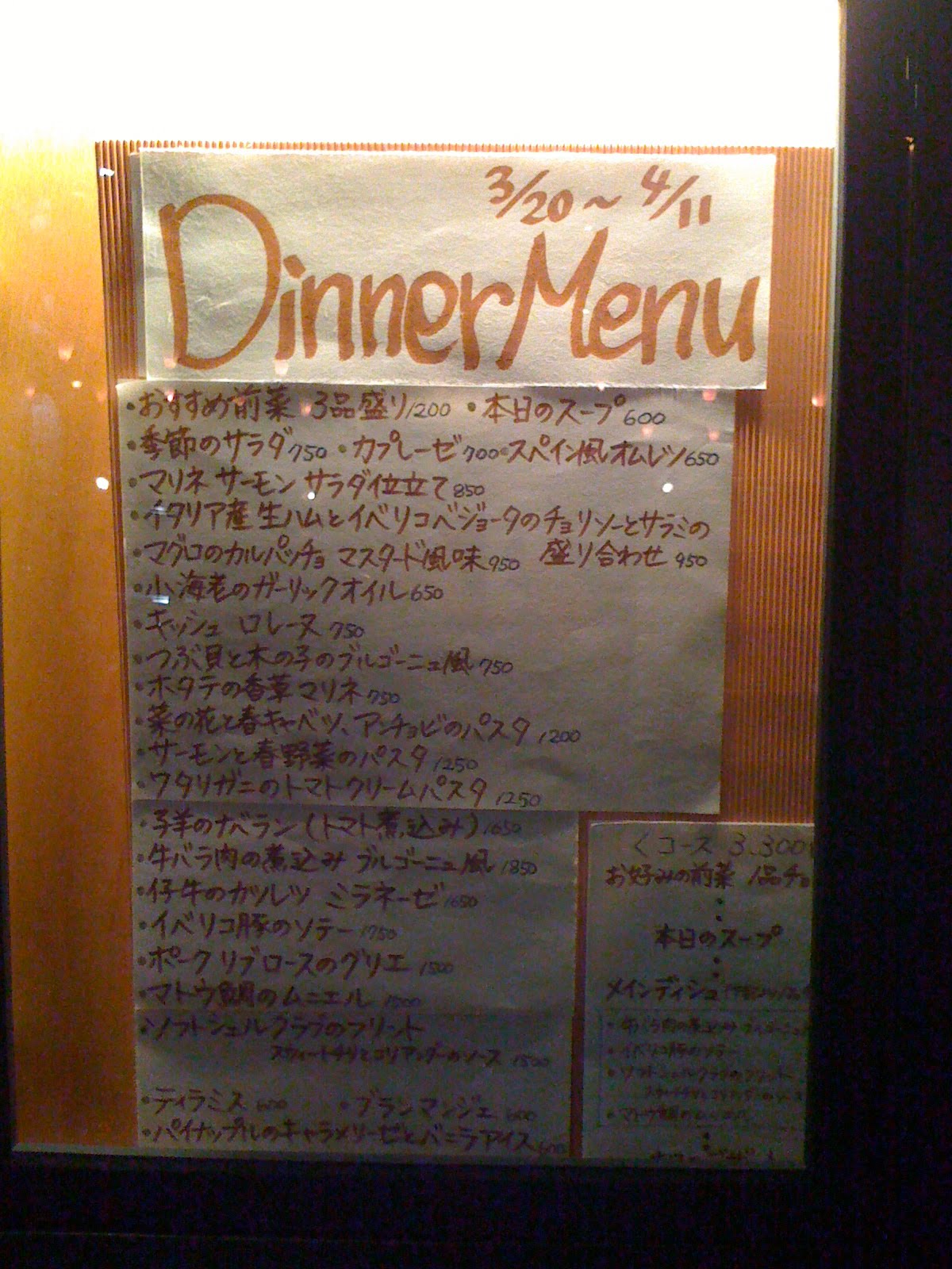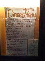 夜のメニュー。パスタもあるんですね〜。意外とお手頃なお値段では。