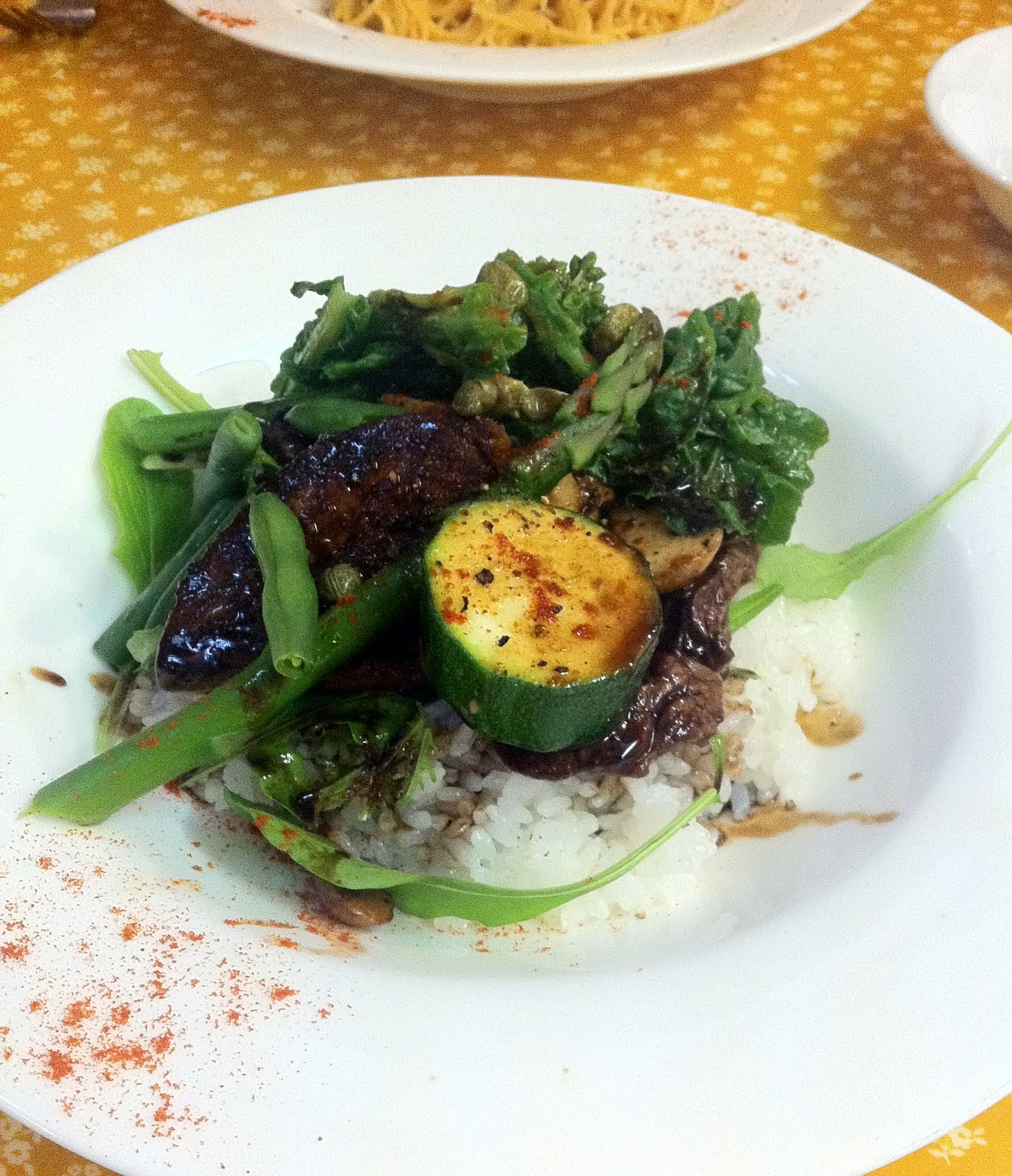 フォアグラ一切れと(たぶん)ハラミステーキに菜の花やズッキーニ、アスパラガス、キノコなどが付け合わせ。
