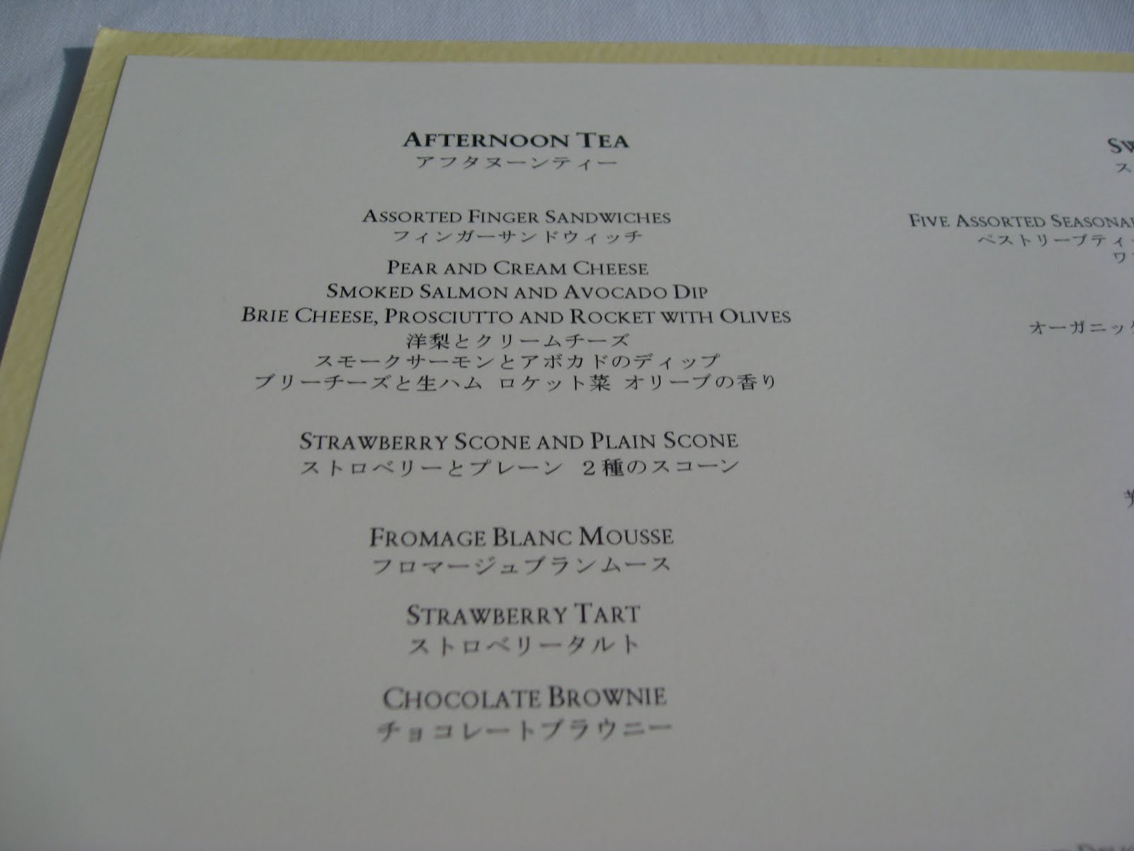 アフタヌーンティーのメニュー。