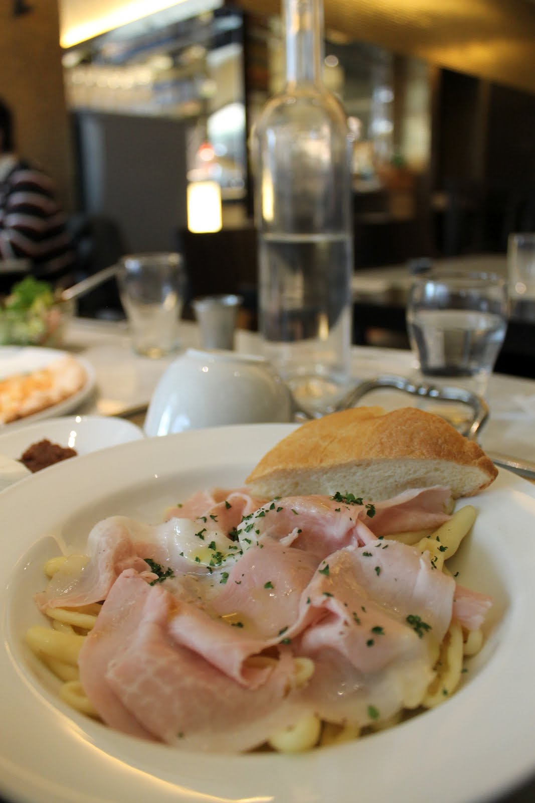パスタは、生パスタ(イタリア直輸入)に惹かれて、自家製プロシュートコットとマッシュルーム グラナパダーノソース。