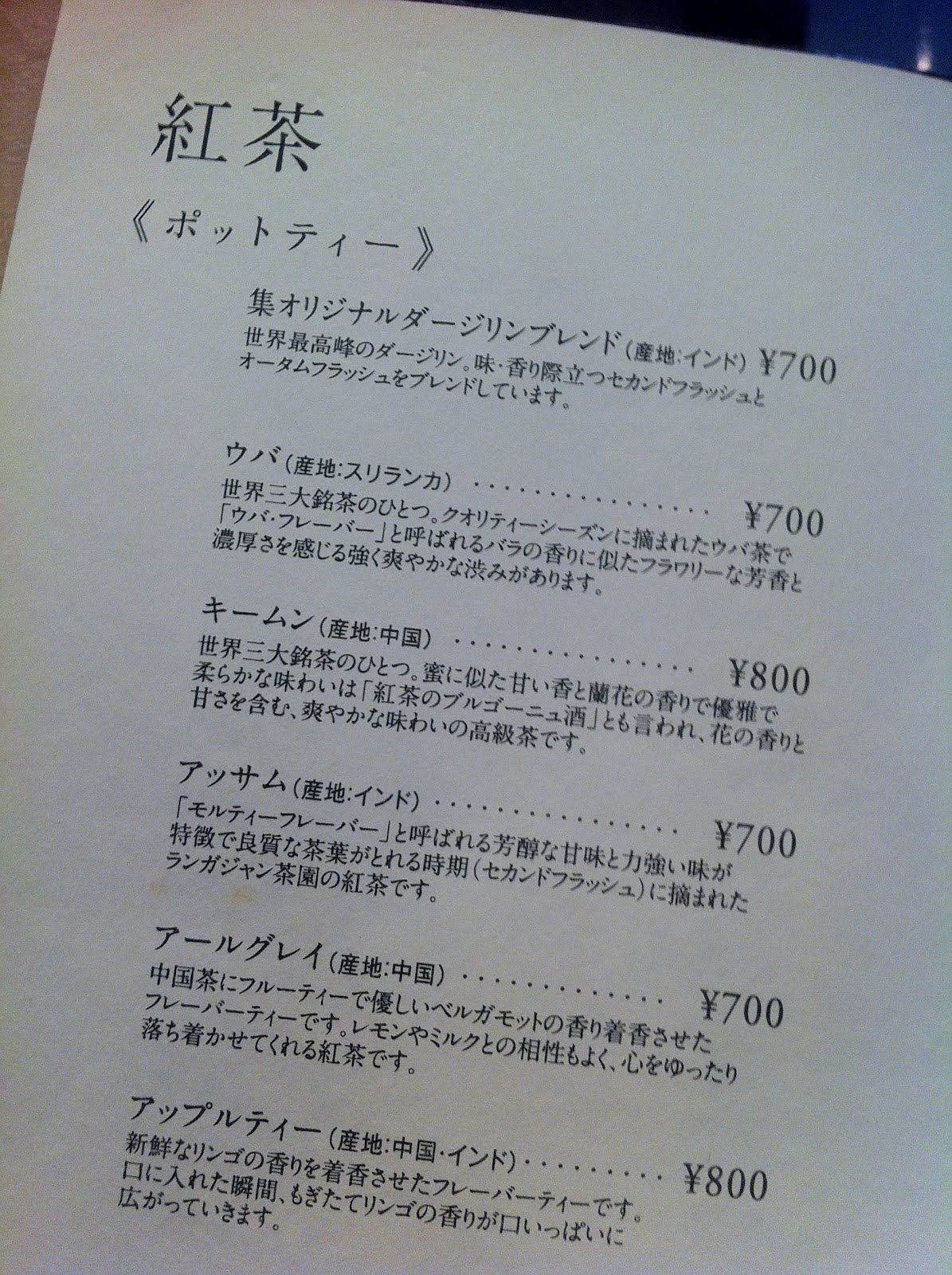 飲み物は珈琲が美味しそうだし珈琲にしようかとも思いましたが、メニューを見ると紅茶も真面目そうだったので集オリジナルダージリンブレンド(産地:インド)に。