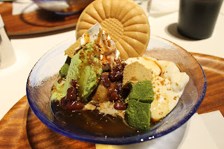 わらび餅と豆乳花(トールーファ)、烏龍茶ゼリー入りの和風パフェ。330kcal。