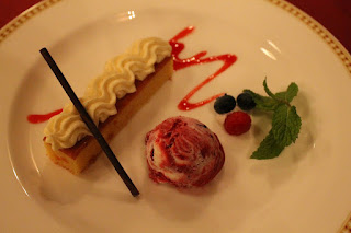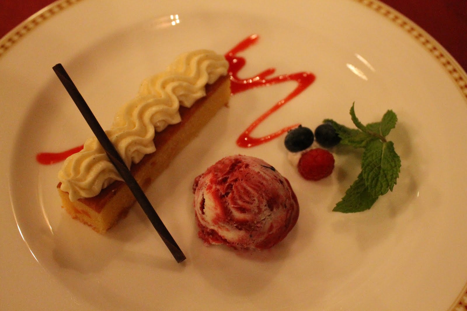 オレンジケーキの上にカスタード。カシスとミルクのマーブルアイス。オレンジケーキはオレンジ!って感じの香りで良かった♪