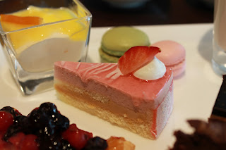 苺とキャラメルのケーキ。マカロンは固めでねちょっとしてイマイチ。左上の米粉のプリンはさっぱりで美味。