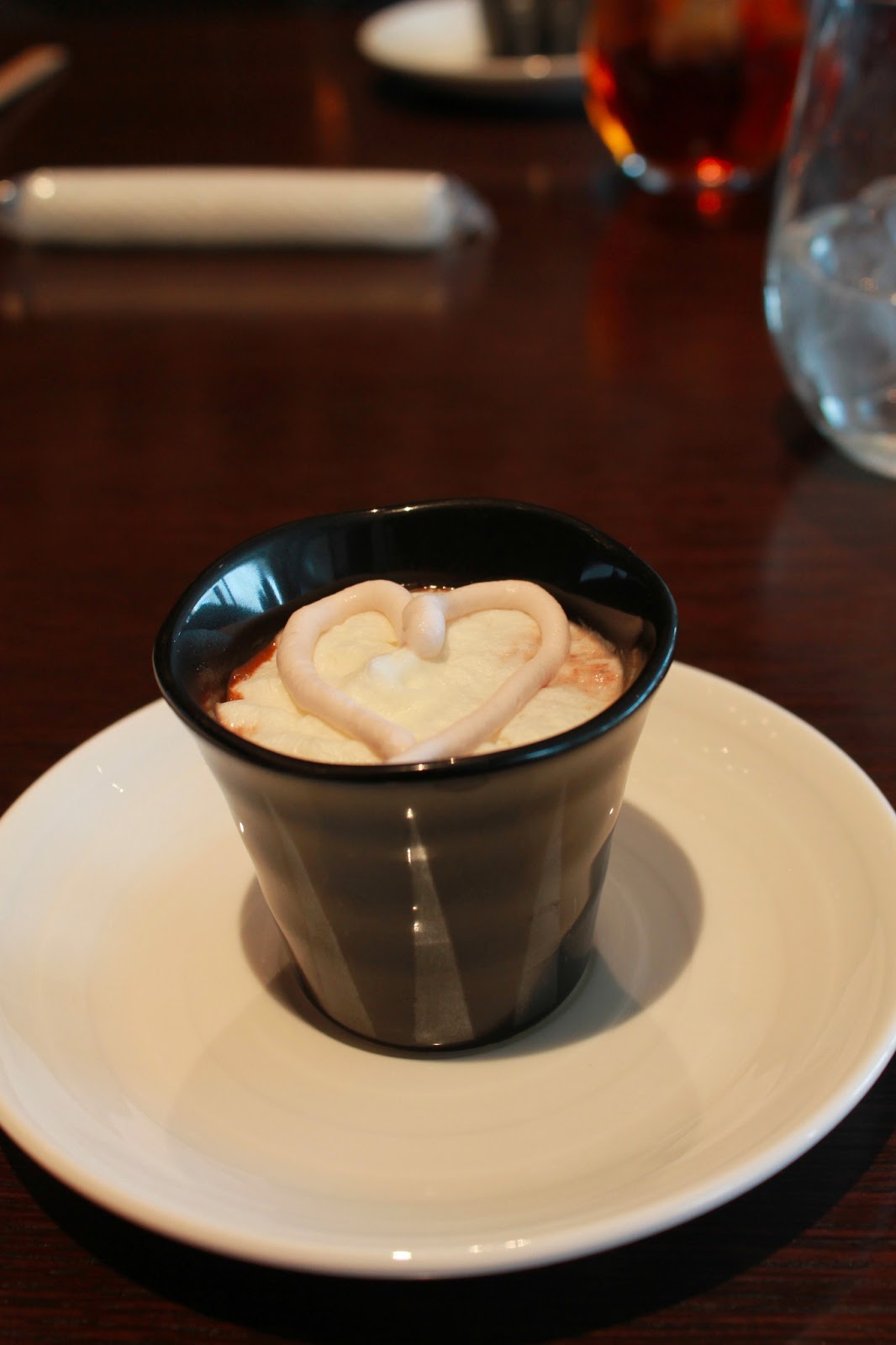 初めの一皿、ソースアート ディッシュ ショコラショー(ホットチョコレート)。泡のハートは目の前で描いて頂けます。