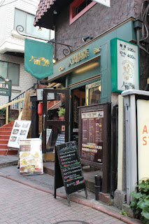 お店の外観、コーヒー200円、ビール400円という看板が見えます。