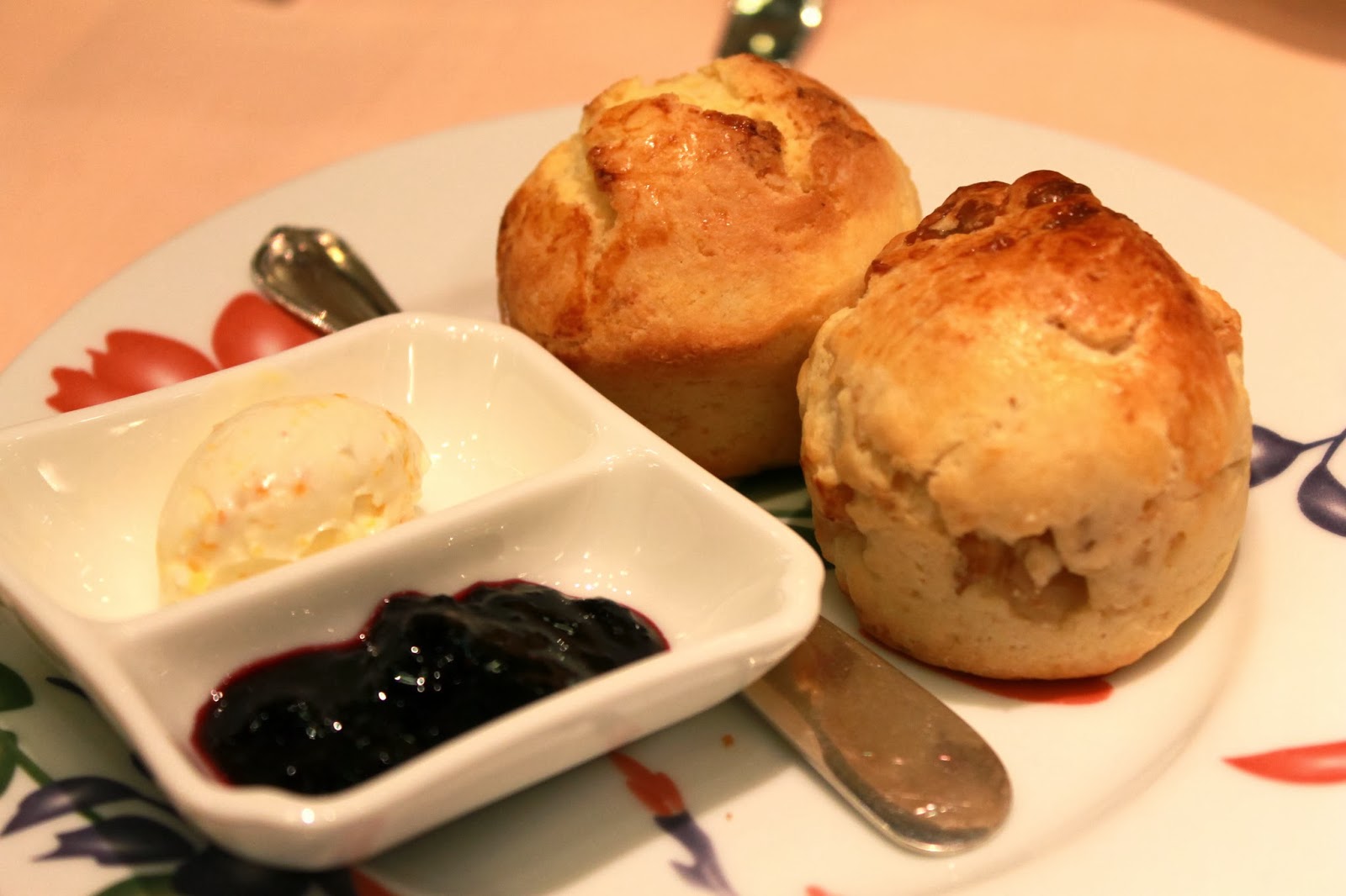 添えられているのは、ブルーベリーのジャムと、もうひとつ、クロテッドクリームと思いきや、柑橘系の皮が入ったクリームチーズだと思われます。