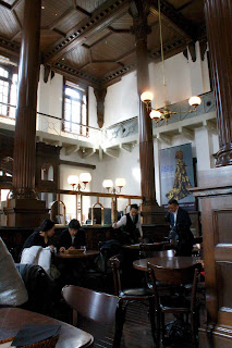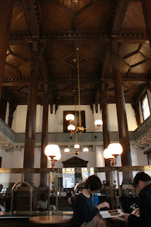 三菱一号館美術館は、ジョサイア・コンドル設計の建物を復元したもので内装はクイーン・アン様式。カフェは三菱合資会社の銀行部が入っていたところだそうです。